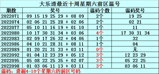 温号:最近十周星期六前区开出20个温号,上周星期六前区开出3个温号,本周星期六关注温号26。