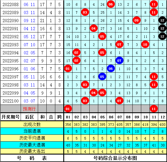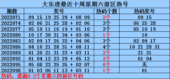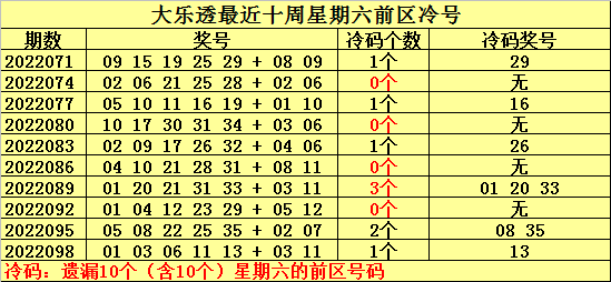 冷号:最近十周星期六前区开出9个冷号,上周星期六冷号出现1个,本周星期六放弃冷号出现的可能。