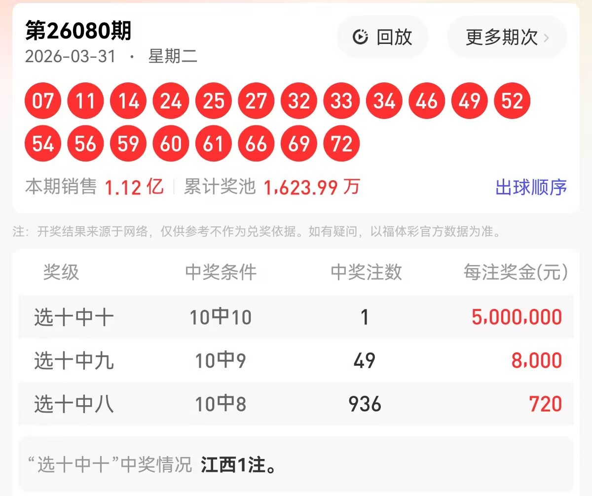 上期福彩快乐8第 2026080期开奖号码为【07 11 14 24 25 27 32 33 34 46 49 52 54 56 59 60 61 66 69 72】,其中大小比11:9,奇偶比为9:11,和值为851,跨度65,四区间比为3:6:7:4。下面是对本期对于每个号码的详细分析。