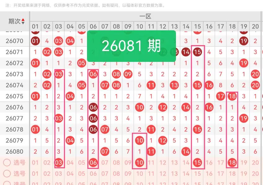 上期第一区间开奖3个号码,本期可能会增加开出。03在前端区域中位置适中,整体走势平稳,没有出现大幅跳跃与周边号码形成稳定的过渡结构。06整体表现温和有序,在区间内活跃度适中,能够很好地平衡前端小号与中部号码的衔接。10处于一区中心位置,承前启后作用明显,无论是与前端小号还是后半段号码都能形成良好呼应。15靠近一区尾部,与二区号码衔接紧密,近期走势连贯,出号节奏规律,能够有效提升区间覆盖的完整度。18作为一区收尾号码,活跃度保持良好,与相邻区间号码形成自然过渡,使整体布局更加完整。