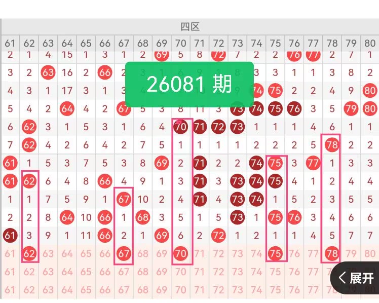 上期第四区间开奖4个号码,本期可能会稳定开出。62处于四区前端,与三区尾部衔接自然,走势平稳,能够保持前后区间的流畅过渡。67在四区中段位置表现稳定,出号节奏规律,形态连贯,与周边号码形成良好联动,增强组合整体性。70处于四区中心位置,承上启下作用突出,既能连接前端号码,也能延伸至后半段,让整体布局更完整。75活跃度适中,位置关键,与前后号码形成有序排布,使组合更具层次感与连续性。78作为四区尾部号码,能够有效覆盖末端区域,补齐整体结构,让号码分布更全面。