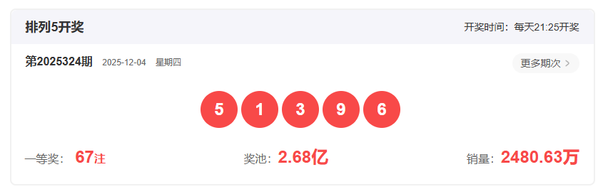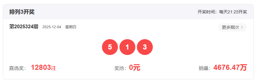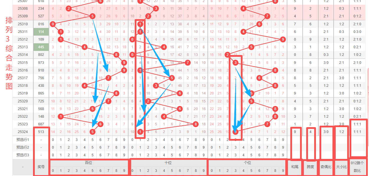 体彩排列3第2025324开奖号码513,形态为组六,奇偶比3:0,和值9,跨度4,大小比1:2,【012】路个数比1:1:1。