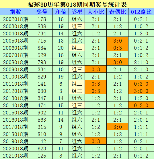 组选类型判断:在第018期历史同期开奖中,组六开出14次,组三开出6次,今年同期防开出组三号码。
