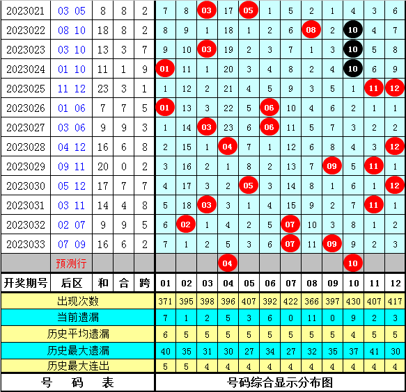 开奖回顾:体彩大乐透第23033期奖号为:04 06 10 11 25+07 09,前区奖号012路比为1:3:1,奇偶比为2:3,三区比为4:0:1,后区为全大组合。