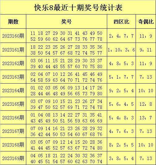 福彩快乐8第2023169期开奖回顾:04 05 18 21 22 24 30 32 36 37 40 45 51 54 57 60 62 63 70 74,其中奖号四区比为3:8:5:4,奇偶比为7:13。