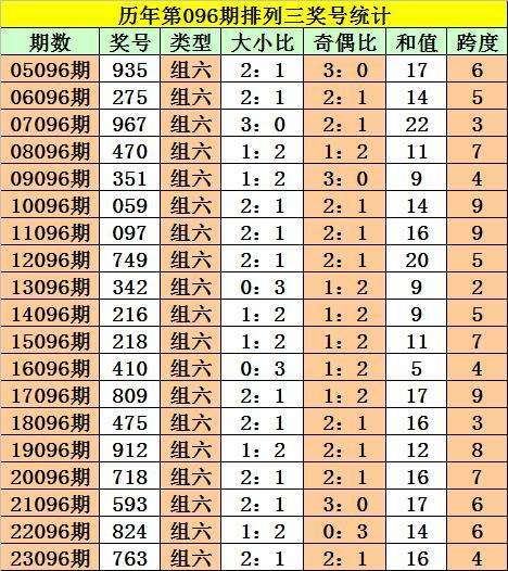 历年第096期奖号中:组六开出19次,组三全部轮空。组六明显活跃,本期关注组六。