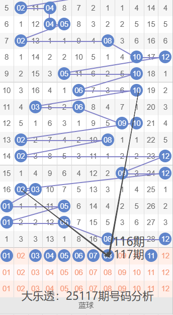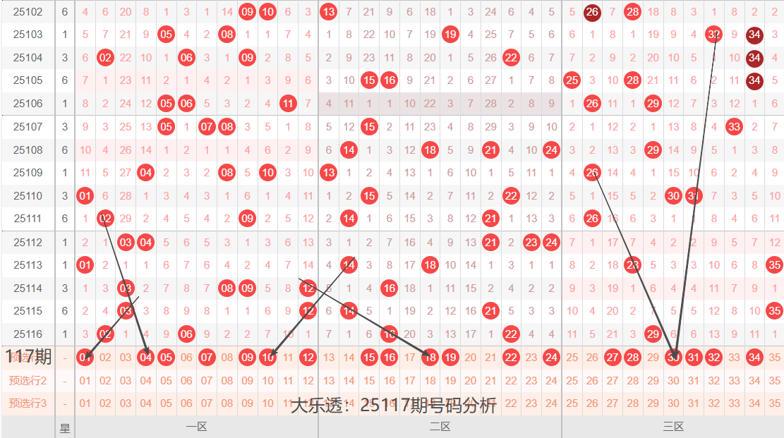 通过上期号码的简单分析,我们看下25117期红色号码球的总体走势,如下图: