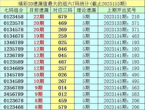 1。截止第23153期,七码组六遗漏最大的是:0123458,当前遗漏22期。