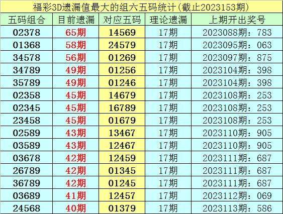 4。截止第23153期,五码组六遗漏最大的是:02378,当前遗漏65期。短期解冻的可能性较小,则23154期奖号分布在02378-14569之中的可能性最大。