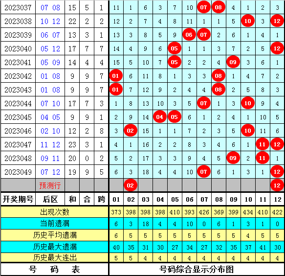 后区分析:上期后区开出奖号07、12,为一奇一偶组合,本期看好偶数号码转热,预计出现全偶组合,后区两码参考02 12。
