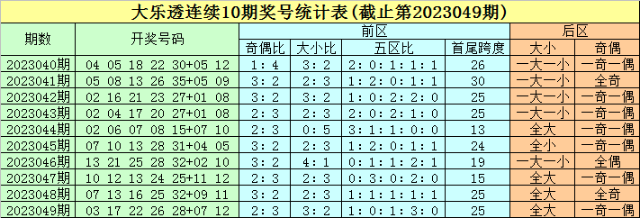 上期回顾:体彩大乐透第2023049期开出奖号:03 17 22 26 28 + 07 12。其中前区奖号奇偶比为2:3,大小比为3:2,五区比为1:0:1:3:0,跨度为25。后区奖号大小比为2:0,奇偶比为1:1。
