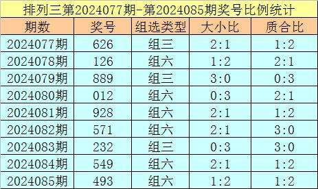 上期回顾:排列三第2024085奖号开出493,奖号质合比为1:2,大小比为1:2,跨度为6,类型为组六。