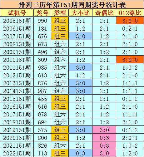 012路分析:历史上排列三第151期同期奖号中,012路奖号总个数比为26:15:13,012路奖号轮空期数比为3:5:9,今年第151期预计012路号码平衡出现,关注012路比1:1:1。