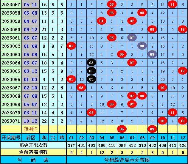 后区分析:上期后区开出1路+0路奖号10+12,最近10期后区奖号012路比为8:7:5,本期防全0路组合再出,精选两码06、09。