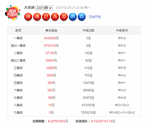上期开奖:大乐透第2023018期开奖号码为:04 08 17 26 30 +03、11,各位号码遗漏值分别为:1 2 5 7 10 + 5 0。