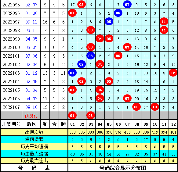 后区分析:最近7周星期一一大一小出现1期,全大出现2期,全小出现4期;全偶出现2期,一奇一偶出现5期,全奇出现0期,本期后区两码参考01和03。
