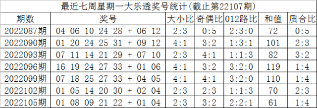 大乐透第2022105期(上周星期一)奖号为:01、08、09、21、22+01、04。