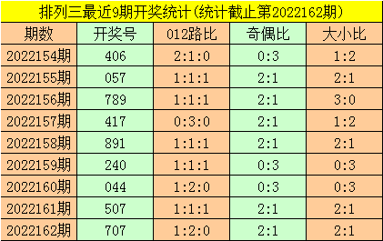 上期回顾:排列三第2022163期奖号为:771。大小比为2:1,奇偶比为3:0,012路比为0:3:0。