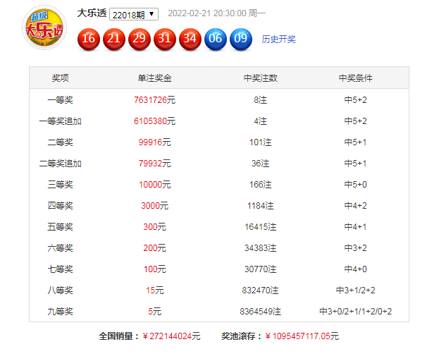 开奖回顾:大乐透第22018期开出16、21、29、31、34+06、09。前区特征:奇偶比:3:2,大小比:4:1,首尾间距:18。