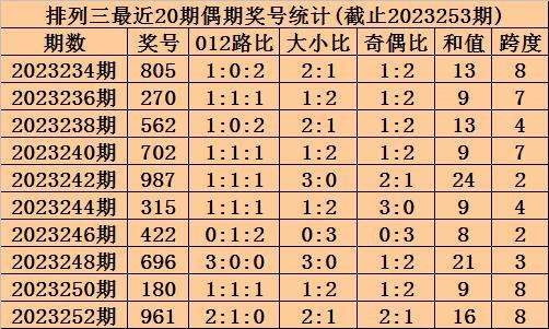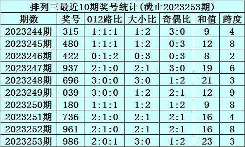 上期回顾:排列三2023253期奖号为986,奇偶比为1:2,大小比为3:0,跨度为23。