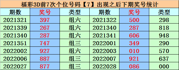 在百位号码7前7次开出之后,其下期分别开出号码:6、3、2、2、2、8、6,其中号码012路比为3:0:4,奇偶比为1:6,大小比为3:4。