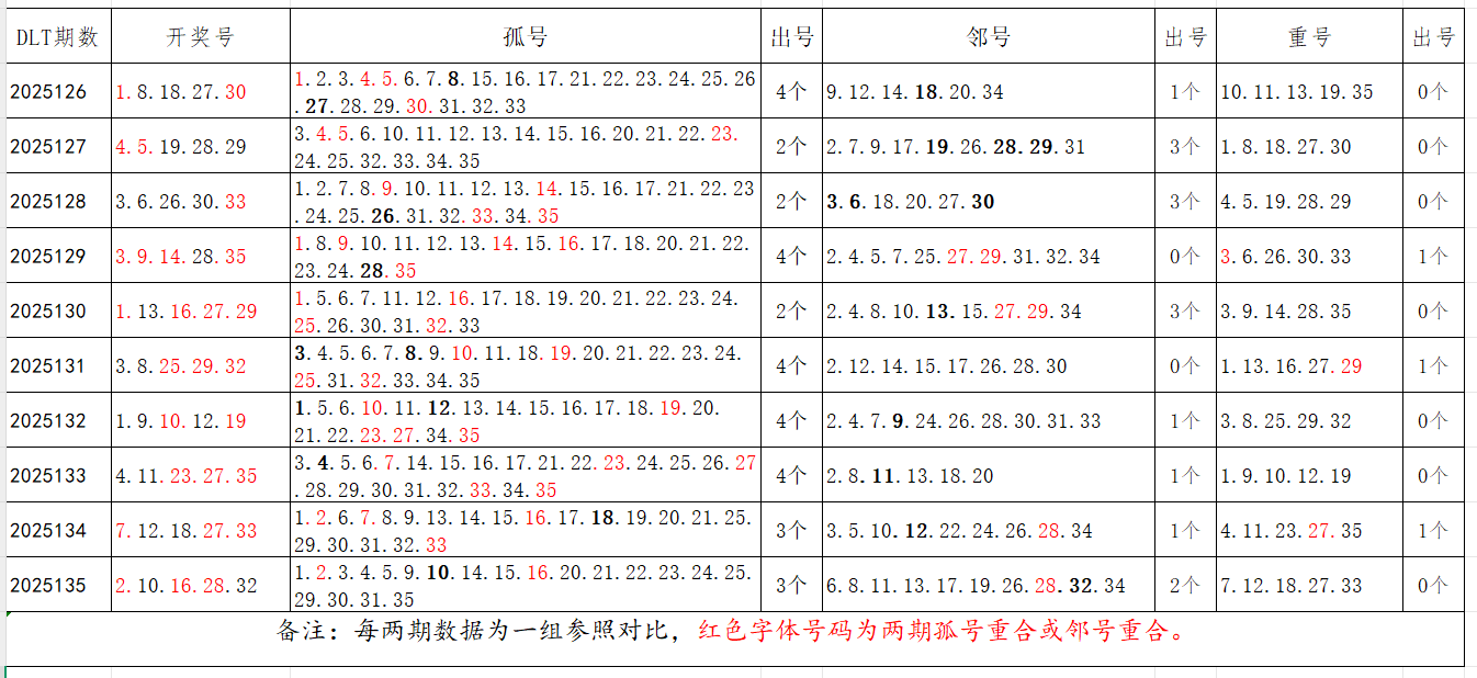 如图,以近两期数据为一组,进行对比分析,相同的孤号、邻号可能在下期开出。本期参考孤号:4.5.6.7.8.12.13.14.18.19.20.21.22.23.24.25.26.30.34.35;邻号:1.3.9.11.15.17.27.29.31.33。重点关注:孤邻号重合号码:***(会员专区可见)。个人分析,仅供参考。