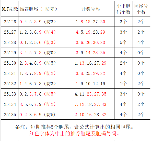 如图,每期推荐胆尾中出1-4个。上期推荐胆尾中出3尾4码!推荐胆尾是按照公式计算的顺序,不定位红球号码的顺序。本期推荐胆尾:7尾/4尾/1尾/0尾/9尾,加推防守胆尾+胆码号码:***(会员专区可见)。个人分析,仅供参考。