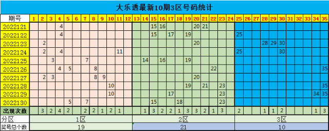 三区(一区1-12,二区13-24,三区25-35)出号个数统计: