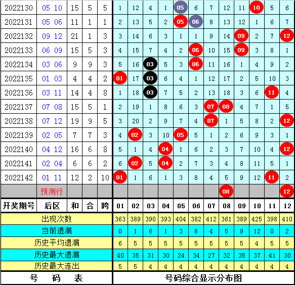 后区奖号分析:最近10期后区奖号012路个数比为8:6:6,其中1路号码明显活跃,本期防1路号码转冷轮空,后区号码大范围关注03、08、09、11、12。