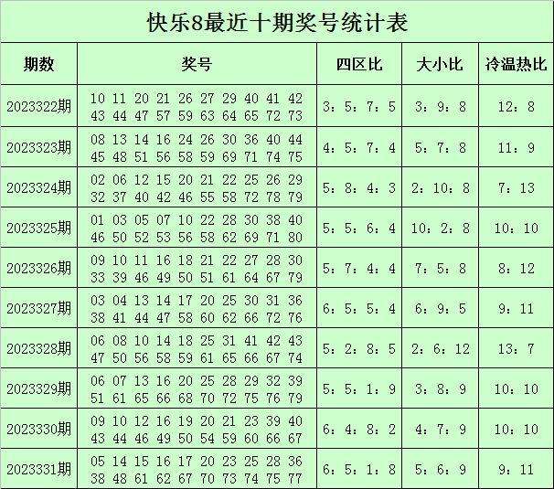 福彩快乐8第2023331期开奖回顾:05 14 15 16 17 20 23 25 28 36 38 48 61 62 67 70 73 74 75 77,其中奖号四区比为6:5:1:8,冷温热码比为5:6:9,大小比为9:11,和值为844,同尾号码为20 70、23 73、14 74、05 15 25 75、16 36、17 67 77、28 38 48。