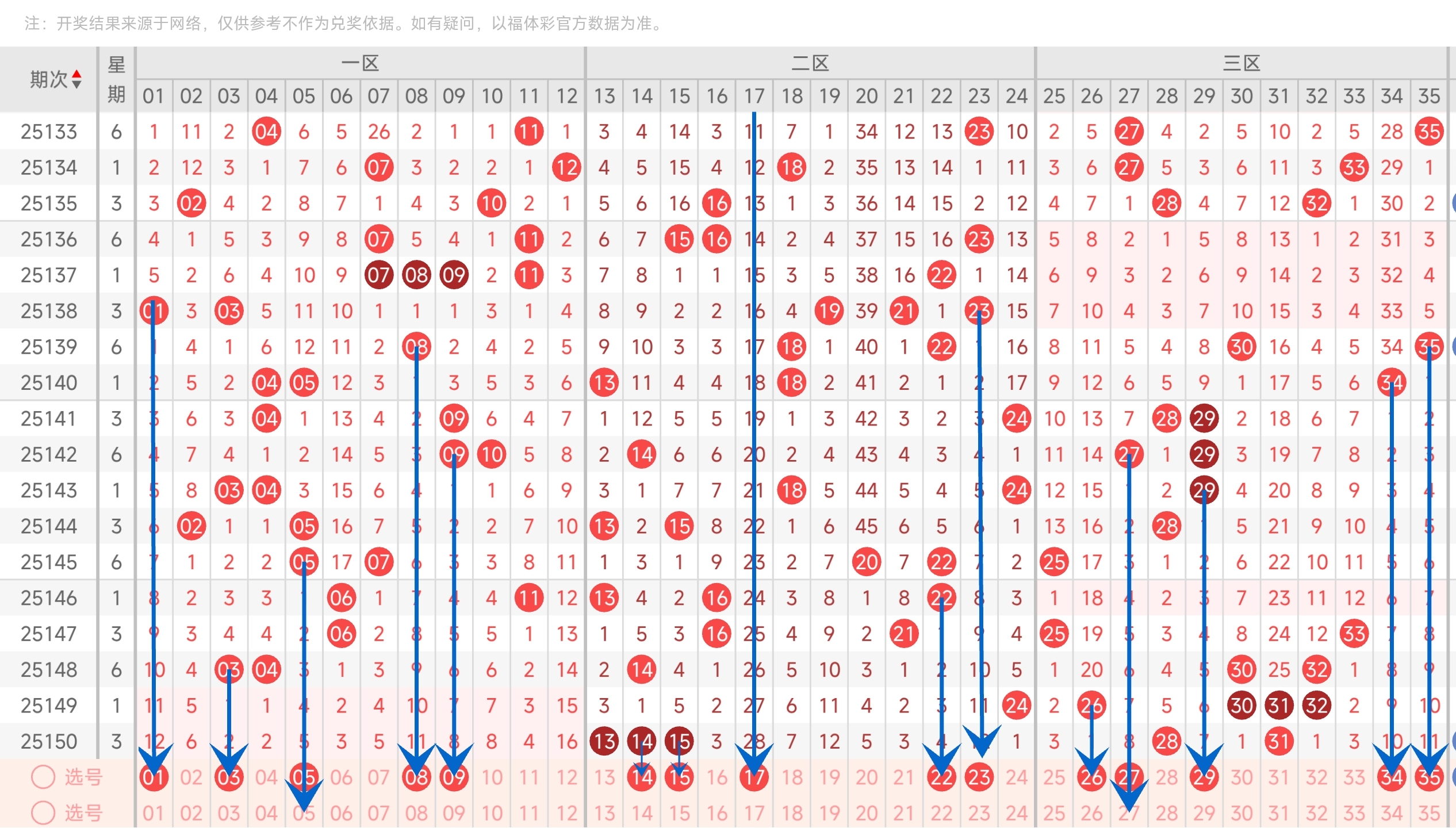上期开出了28,31号码,往前一期开出了26,30,31,32号球。通过分析走势图,可以看到最近几期都是开在中间的号码,比较密集,本期推测会往左右两边发散。最后再结合冷热号和遗漏期数,本期我们可以关注26,27,29,34,35等号。综上所述本期三区我们推测可能会开26,27,29,34,35等号码。