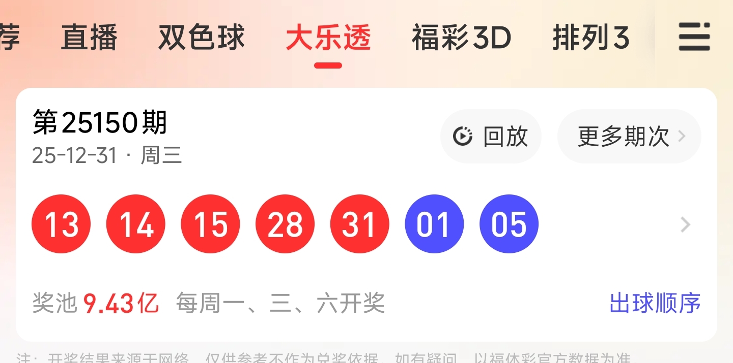 第25150期大乐透文章推荐中命中14,15,28,31等4个红球。
