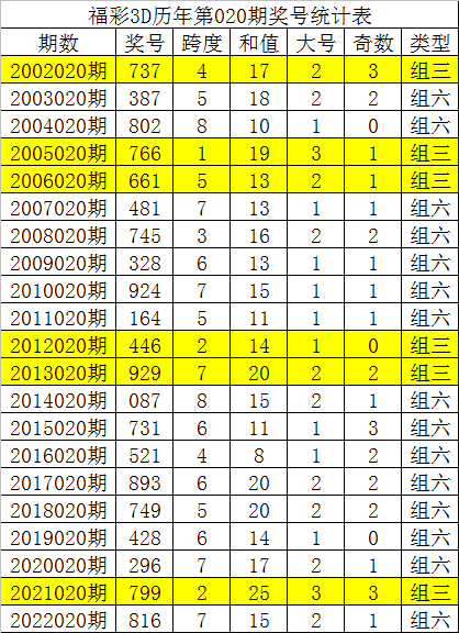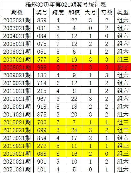 福彩3D历年第021期同期分别开出奖号:859、031、084、075、051、577、999、135、714、215、967、918、875、700、699、854、272、088、901、401,详细统计见下表: