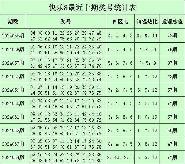 福彩快乐8第2024064期开奖回顾:02 10 23 24 27 28 29 32 33 35 36 38 52 54 67 70 72 73 74 80,其中奖号四区比为2:10:2:6,冷温热码比为5:3:12,遗漏总值为77。