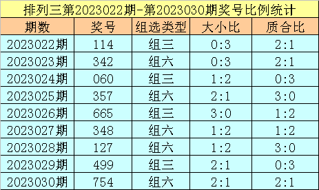 上期回顾:排列三第2023030奖号开出754,奖号质合比为2:1,大小比为2:1,跨度为3,类型为组六。