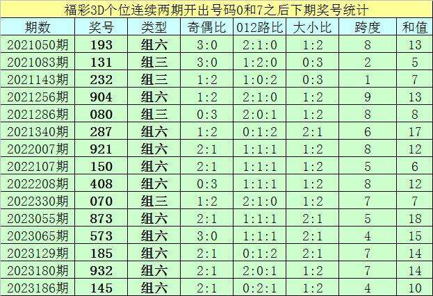 个位号码:最近两期个位开出号码为0-7,在福彩3D历史开奖中,前后两期个位分别开出号码0-7的奖号出现了92次。最近15期个位0-7组合出现之后,其下期奖号分别为:193-131-232-904-080-287-921-150-408-070-873-573-185-932-145;