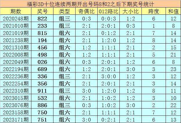 十位号码:前两期十位分别出现奖号8-2,历史上福彩3D连续前后分别开出号码8-2的现象共开出71次。在十位8-2的现象出现时,最近15期其下期分别开出号码:822-233-815-194-456-498-026-689-336-356-911-532-886-750-751;