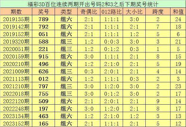 百位号码:连续两期百位出号分别为:2-3,历史上福彩3D连续两期前后分别出号2-3的奖号共出现87次。在百位2-3的奖号现象出现时,近15期下期分别出号:789-792-051-588-221-915-496-626-012-797-755-509-197-463-165;