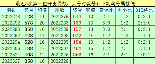 前7次第三位号码开出偶数、大号时奖号分别为:128、578、358、428、628、188、408,其中奇偶总比例为6:15,有2期奇偶比与上期奇偶比相同;号码大小总比例为12:9,有3期奖号大小比与上期大小比相同;