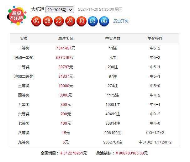 大乐透第2024135期奖号开出:前区06、08、22、24、30,后区03、08。前区号码五区比为1:1:0:2:1,质合比为0:5,012路比为3:1:1,后区开出0路+2路号、一质一合组合。
