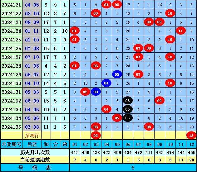 前区质合分析:上期前区奖号质合比为0:5,与前期相比质数号码减少3个,最近30期前区质合比为53:97,最近10期质合比为21:29。根据近期走势,本期注意质数号码增加,参考质合比2:3。