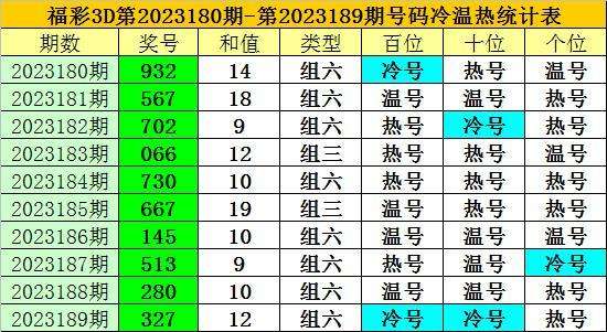 上期回顾:福彩3D第2023189期开奖奖号为:327,奖号类型为:组六,奖号冷温热态为:冷号+冷号+热号。