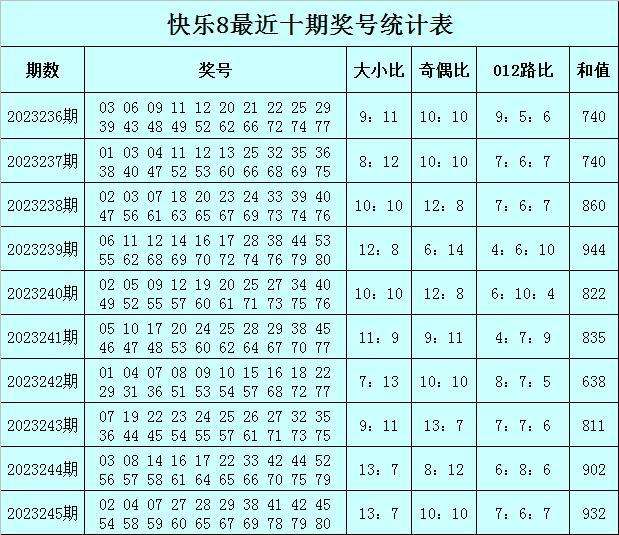 福彩快乐8第2023245期开奖回顾:02 04 07 27 28 29 38 41 42 45 54 58 59 60 65 67 69 78 79 80,其中奖号奇偶比开出10:10,大小比开出13:7,012路比开出7:6:7,和值为932,跨度为78。