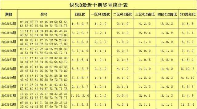 福彩快乐8第2023162期开奖回顾:03 06 11 15 21 28 29 30 33 37 39 40 44 48 55 57 60 70 75 80,其中奖号四区比为4:8:5:3,012路比为11:5:4,和值为781,跨度为77。