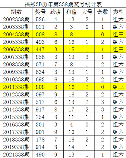 福彩3D历年第338期同期分别开出奖号:526、021、008、493、447、856、071、634、693、808、097、517、917、254、301、901、178、914、490,详细统计见下表: