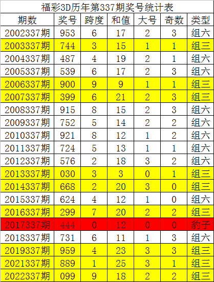 从以上统计可以看出,历年3D第338期开出了3次组三号码,开出了16次组六号码。组六号码出现概率大,本期预计开出组六号码。