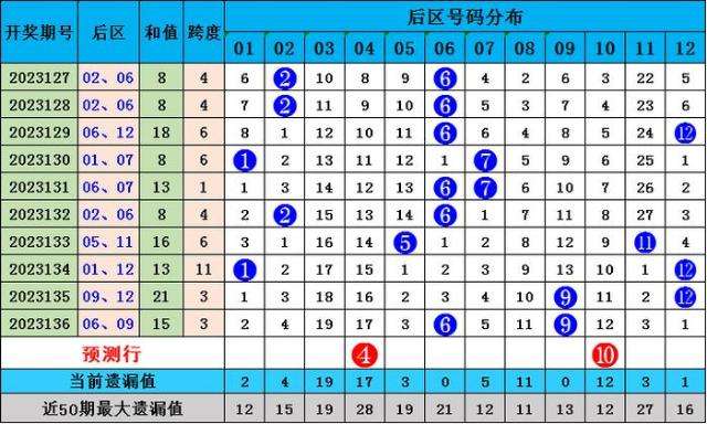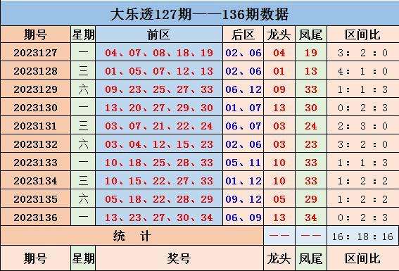 上期回顾,大乐透第2023136开奖,本期奖号:前区13 23 27 30 34;后区06 09,当期前区号码大小比为4:1,三区比0:2:3,奇偶比3:2。前区未开出连号,未开出重号。