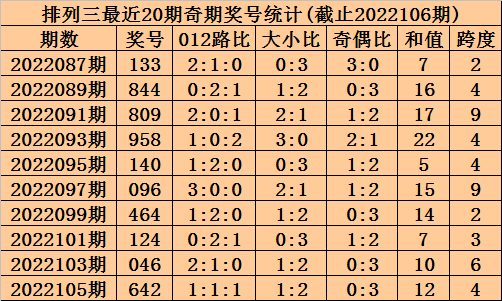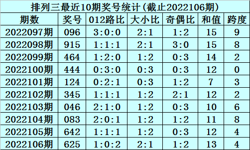 上期回顾:排列三2022106期奖号为625,奇偶比为1:2,大小比为2:1,跨度为13。