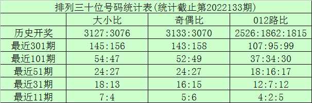 上期回顾:排列三第2022133期奖号为:654。奖号形态组六,大小比2:1,奇偶比1:2,012路1:1:1。