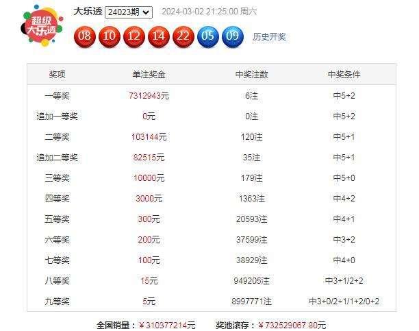 大乐透第24023期开奖。当期开奖号码为:前区08 10 12 14 22,后区05 09。当期前区号码大小比为1:4,奇偶比为0:5,三区比3:2:0;前区开出1组同尾号12 22;后区开出小大组合05 09。